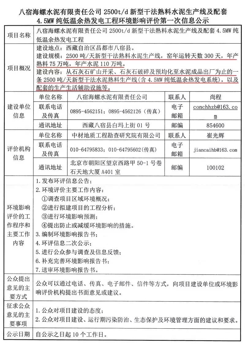 2018年3月5日西藏昌都八宿縣政府官網(wǎng)發(fā)布了《八宿海螺水泥有限責(zé)任公司環(huán)境影響評(píng)價(jià)第一次信息公示》公示內(nèi)容如下: