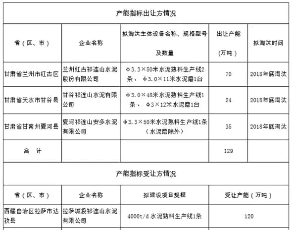 公示顯示,將于2018年底淘汰的三家水泥企業(yè)(合計(jì)產(chǎn)能129萬噸)均位于甘肅省境內(nèi),而產(chǎn)能指標(biāo)受讓方位于西藏自治區(qū)拉薩市達(dá)孜縣,受讓產(chǎn)能120萬噸。