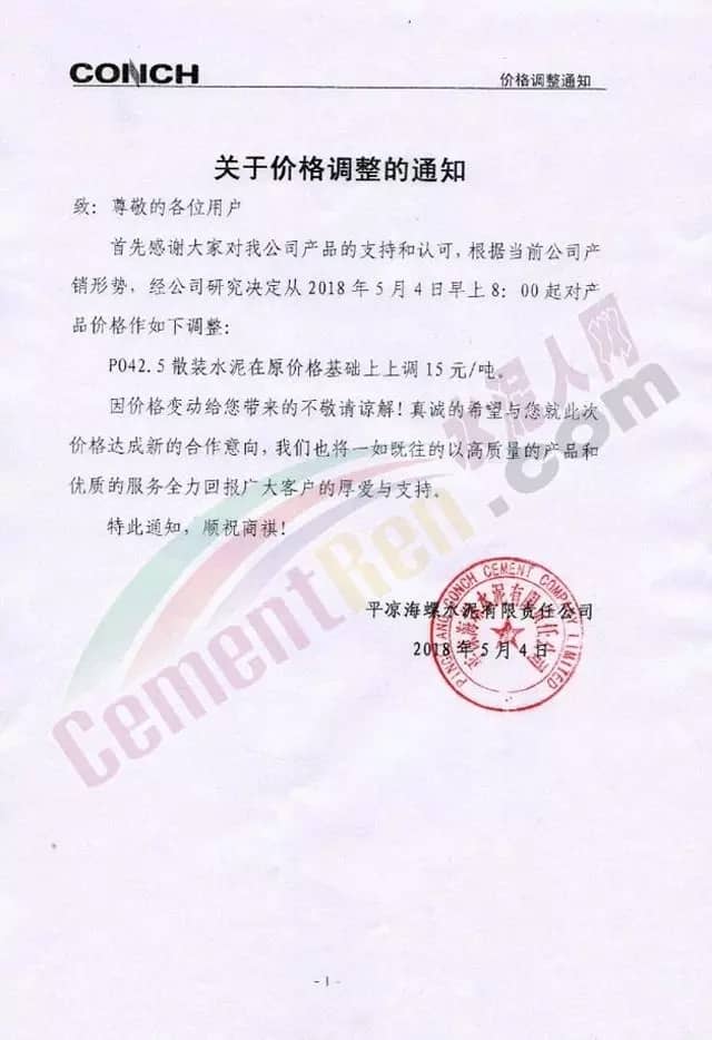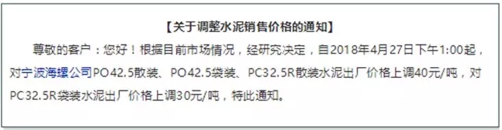 4月27日下午1:00起,寧波海螺公司PO42.5散裝、PO42.5袋裝、PC32.5R散裝水泥出廠價(jià)格上調(diào)40元/噸, PC32.5R袋裝水泥出廠價(jià)格上調(diào)30元/噸