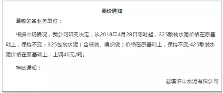 2018年4月28日零時(shí)起,慈溪滸山水泥有限公司32.5散裝水泥價(jià)格在原基礎(chǔ)上,保持不變;32.5包裝水泥(含紙袋、編織袋)價(jià)格在原基礎(chǔ)上,保持不變;42.5散裝水泥價(jià)格在原基礎(chǔ)上,上調(diào)40元/噸。
