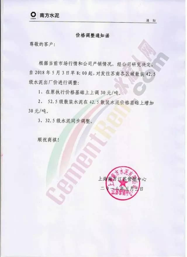 5月5日上海南方水泥旗下宣城南方水泥開始執(zhí)行上調(diào)后新價(jià)格