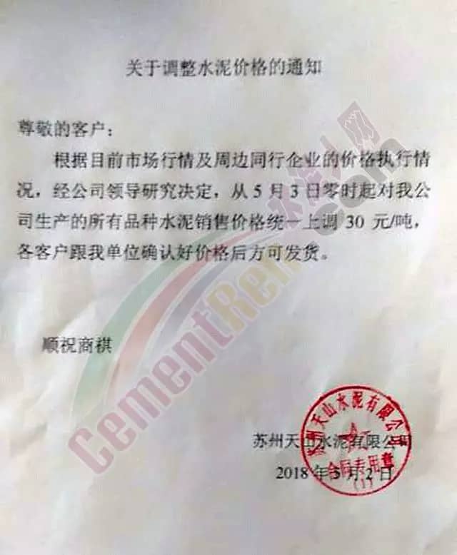 5月3日零時(shí)起蘇州天山水泥所有品種水泥銷售價(jià)格統(tǒng)一上調(diào)30元/噸。