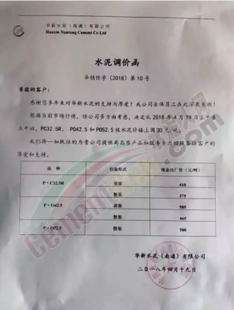 4月12日下午2點(diǎn)華新水泥(南通)有限公司起各標(biāo)號(hào)水泥上調(diào)20元/噸