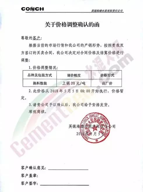 5月4日早8點(diǎn)開始,冀東海天所有品種水泥上調(diào)20元/噸