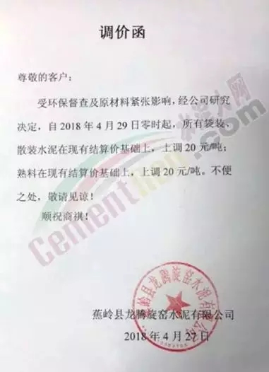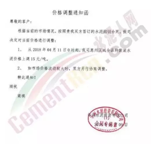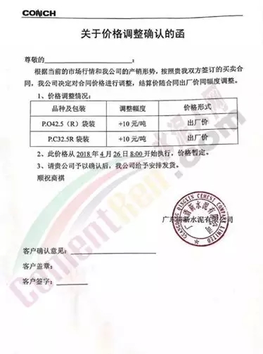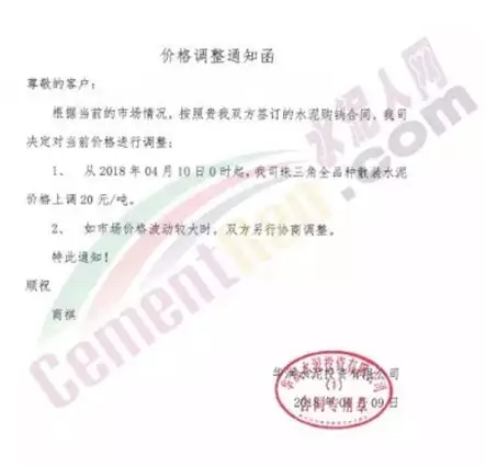 4月16日,浙江杭州區(qū)域建德海螺水泥通知下游客戶PC32.5R各品種水泥價(jià)格上調(diào)20元/噸;PO42.5各品種水泥價(jià)格上調(diào)30元/噸。