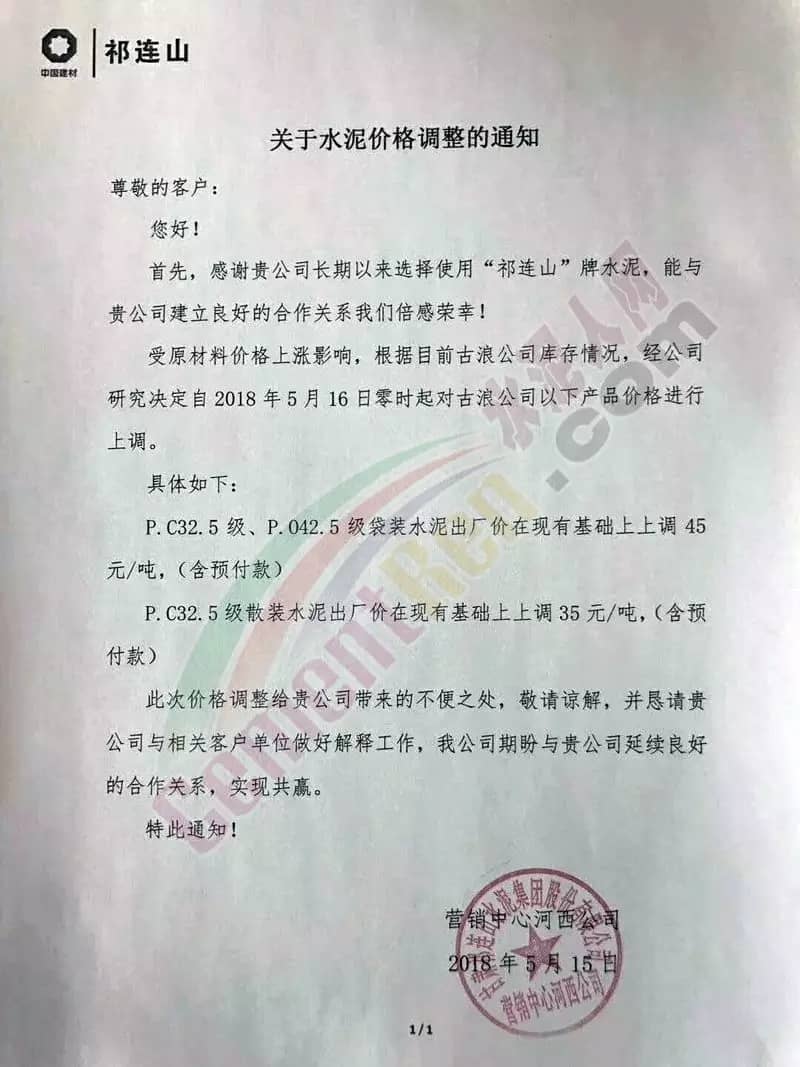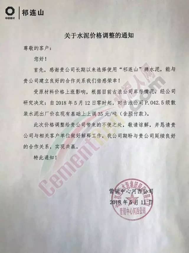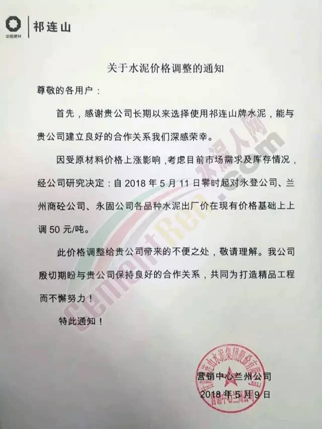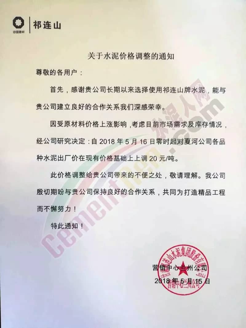 祁連山水泥調(diào)價(jià)通知