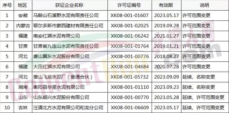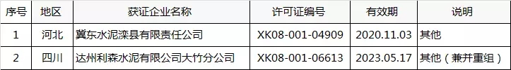 本次發(fā)放的水泥生產(chǎn)企業(yè)許可證包括新發(fā)證1家;說明為其他和其他(兼并重組)的共兩家企業(yè);名稱及許可范圍變更的10家企業(yè),到期延續(xù)的23家企業(yè)。