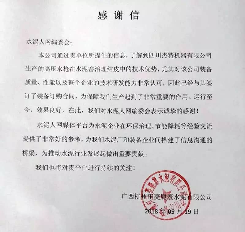 正菱鹿寨水泥負(fù)責(zé)人表示:通過(guò)水泥人網(wǎng)介紹的四川杰特機(jī)器有限公司的產(chǎn)品對(duì)正菱鹿寨水泥的生產(chǎn)起到了很大的推動(dòng)作用。