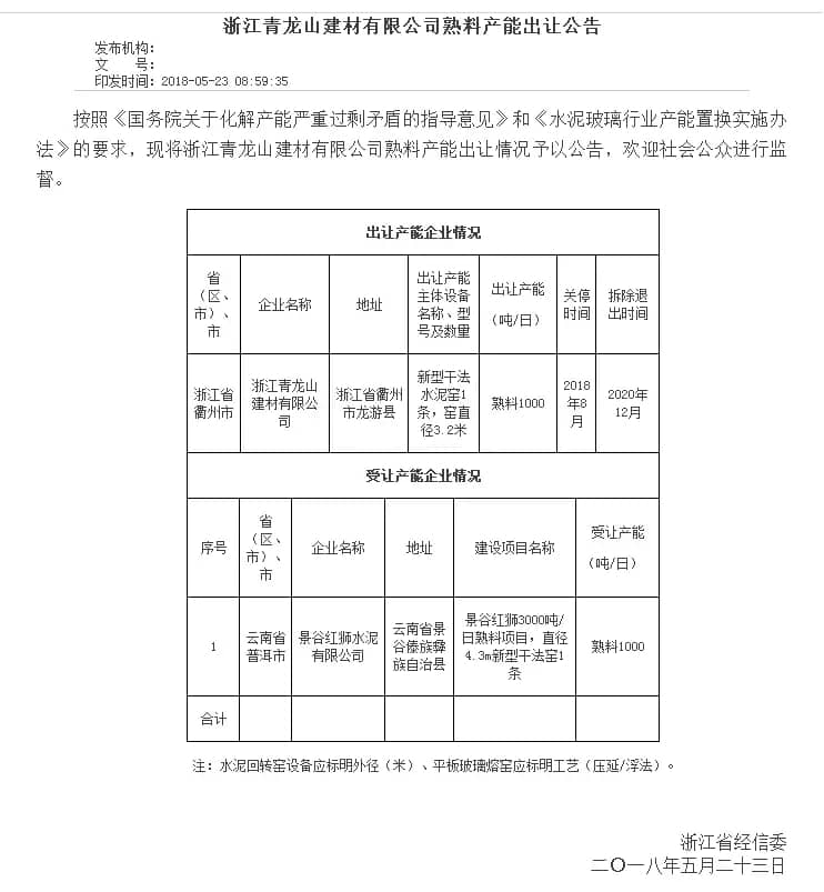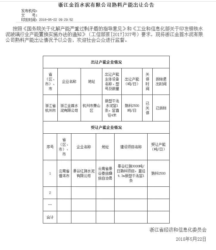 兩則公告中出讓的熟料產能受讓方均為位于云南省景谷傣族彝族自治縣的景谷紅獅水泥有限公司,建設項目為景谷紅獅3000t/d熟料項目(直徑4.3m新型干法窯1條)。其中由浙江金首水泥有限公司出讓2500t/d熟料產能,浙江青龍山建材有限公司出讓1000t/d熟料產能,合計3500t/d。