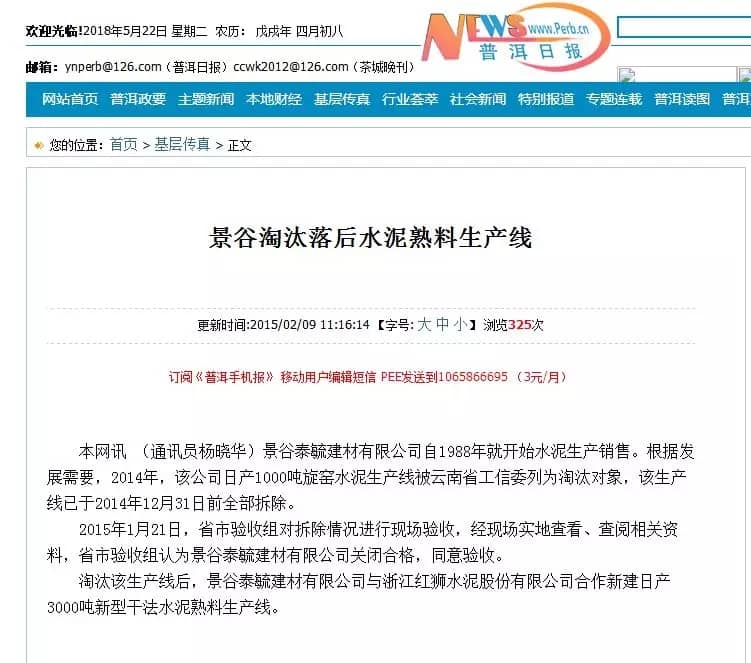 另據《普洱日報》2015年2月9日消息,景谷泰毓建材有限公司原生產線建設規(guī)模為日產1000噸旋窯水泥生產線。在2014年被列為淘汰對象,于2014的12月31日前全部拆除。且于2015年1月驗收通過。淘汰該生產線后景谷泰毓建材有限公司與浙江紅獅水泥股份有限公司合作新建日產3000噸新型干法水泥熟料生產線。