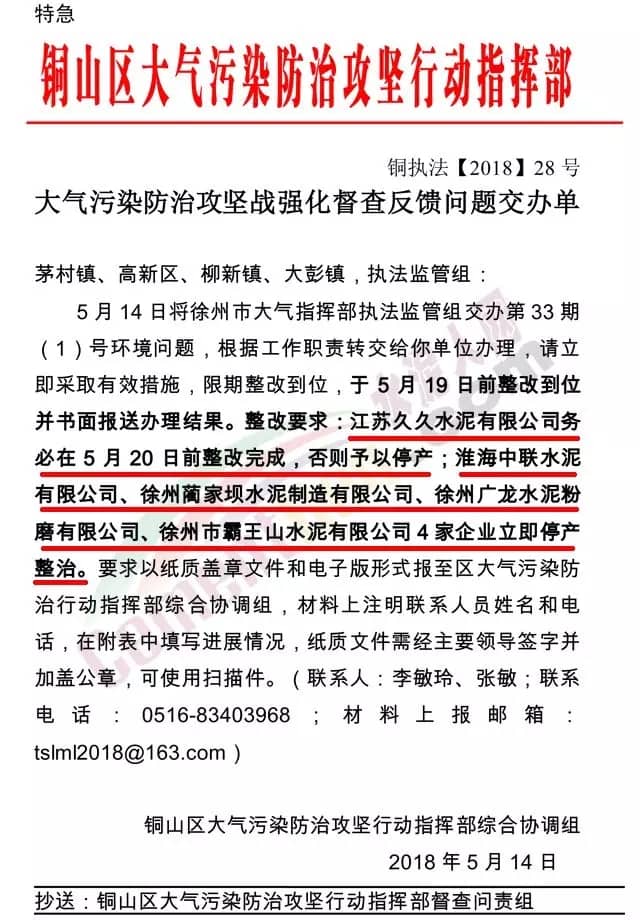 江蘇久久水泥有限公司務(wù)必在5月20日前整改完成,否則予以停產(chǎn);