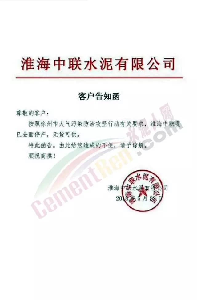 【水泥人網(wǎng)】5月22日淮海中聯(lián)水泥有限公司發(fā)布客戶告知函稱,按照徐州市大氣污染攻堅(jiān)行動(dòng)有關(guān)要求,淮海中聯(lián)現(xiàn)已全面停產(chǎn),無(wú)貨可供。