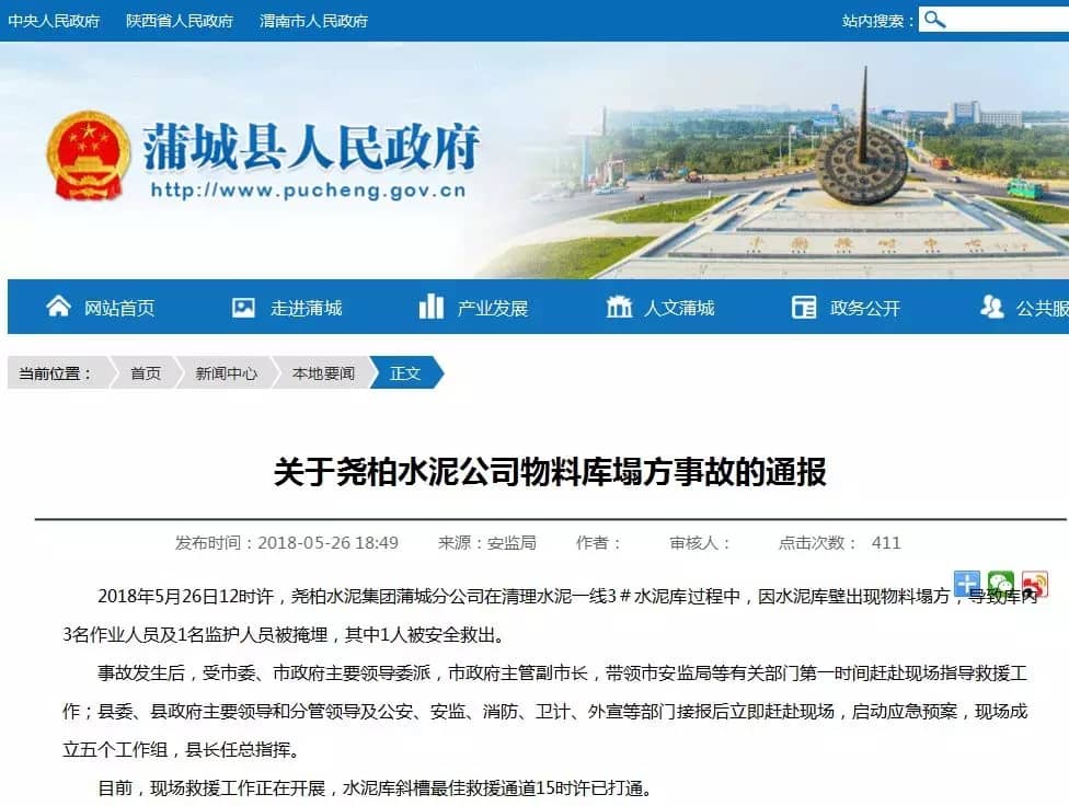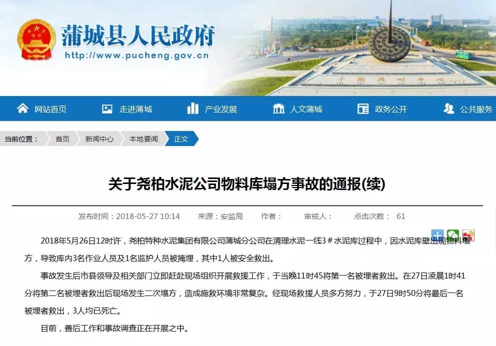 2018年5月26日12時(shí)許,堯柏水泥集團(tuán)蒲城分公司在清理水泥一線3#水泥庫過程中,因水泥庫壁出現(xiàn)物料塌方,導(dǎo)致庫內(nèi)3名作業(yè)人員及1名監(jiān)護(hù)人員被掩埋,其中1人被安全救出。