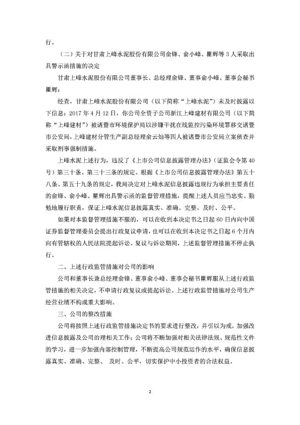 決定書稱,監(jiān)管關(guān)注到,公司未披露以下信息,即公司全資子公司浙江上峰建材有限公司(以下簡稱“上峰建材”)被諸暨市環(huán)境保護(hù)局以涉嫌干擾在線監(jiān)控污染環(huán)境罪移交諸暨市公安局,上峰建材分管生產(chǎn)副總經(jīng)理俞云燦等四人被諸暨市公安局立案偵查并采取刑事強制措施。甘肅監(jiān)管局同時決定對上峰水泥信披違規(guī)行為承擔(dān)主要責(zé)任的俞鋒、俞小峰、瞿輝出具警示函的監(jiān)督管理措施。