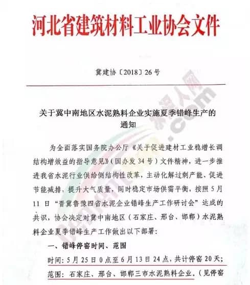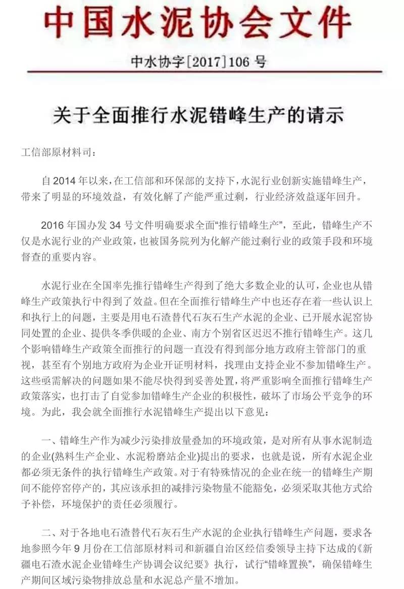 去年11月6日中國(guó)水泥協(xié)會(huì)向工信部原材料司發(fā)出《關(guān)于全面推行水泥錯(cuò)峰生產(chǎn)的請(qǐng)示》,表示錯(cuò)峰生產(chǎn)作為減少污染排放量疊加的環(huán)境政策,是對(duì)所有從事水泥制造的企業(yè)(熟料生產(chǎn)企業(yè)、水泥粉磨站企業(yè))提出的要求,所有水泥企業(yè)都必須無(wú)條件的執(zhí)行錯(cuò)峰生產(chǎn)政策。