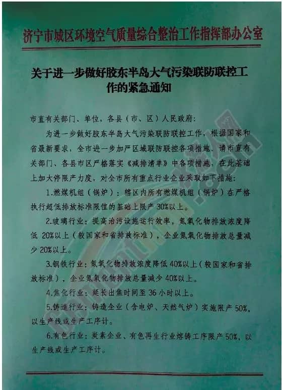 據(jù)水泥人網(wǎng)通訊員消息:6月2日濟寧市城區(qū)環(huán)境空氣質(zhì)量綜合整治工作指揮部辦公室發(fā)布《關(guān)于進一步做好膠東半島大氣污染聯(lián)防聯(lián)控工作的緊急通知》。通知稱:為進一步做好膠東半島大氣污染聯(lián)防聯(lián)控工作,根據(jù)國家和省最新要求,全市進一步加嚴區(qū)域聯(lián)防聯(lián)控各項措施。要求濟寧市直有關(guān)部門、各省市區(qū)嚴格落實《減排清單》中各項措施,并在此基礎(chǔ)上加大停限產(chǎn)力度,對全市所有重點行業(yè)企業(yè)采取措施。