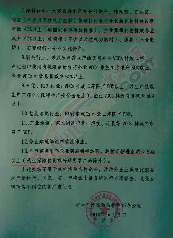 其中針對水泥建材行業(yè)提出,水泥熟料生產(chǎn)線全部停產(chǎn)。同時要求全市重點用車企業(yè)實施錯峰運輸,運輸車國內(nèi)進出減少50%以上。