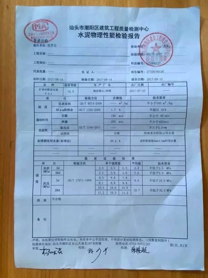 根據(jù)潮陽區(qū)建筑工程質(zhì)量檢測中心9月12日出具的報告,檢驗的水泥抗折、抗壓四個項目的平均值均低于技術(shù)要求,結(jié)論是“不合格”。