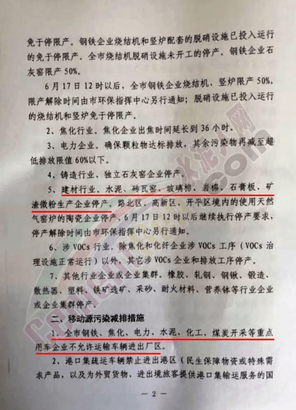 工業(yè)減排方面,建材行業(yè),水泥磚瓦窯、石膏板、礦渣微粉生產(chǎn)企業(yè)停產(chǎn);移動(dòng)源污染減排方面要求全市鋼鐵、水泥、煤炭開采等重點(diǎn)用車企業(yè)不允許運(yùn)輸車輛進(jìn)出廠區(qū);揚(yáng)塵污染減排方面要求各類施工工地要在嚴(yán)格落實(shí)揚(yáng)塵治理“六個(gè)百分百”要求的前提下開展施工,混凝土攪拌站和砂漿攪拌站要在嚴(yán)格落實(shí)揚(yáng)塵治理要求的前提下作業(yè)。對(duì)不能達(dá)到“六個(gè)百分百”和揚(yáng)塵治理要求的施工工地混凝土攪拌站和砂漿攪拌站,一律停工停產(chǎn)。礦山開采、礦石破碎企業(yè)(設(shè)施)停止生產(chǎn)。