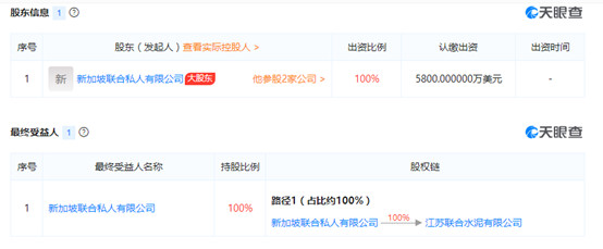 天眼查數(shù)據(jù)顯示,新加坡聯(lián)合私人有限公司為江蘇聯(lián)合水泥有限公司最大股東,股比100%,或?yàn)橹苯涌毓煞健?/p>