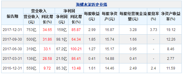 海螺水泥3月23日最新公布的2017年年報(bào)顯示,其營(yíng)業(yè)收入753億元,同比增長(zhǎng)34.65%;歸屬于上市公司股東的凈利潤(rùn)159億元,同比增長(zhǎng)85.87%?;久抗墒找?.99元。
