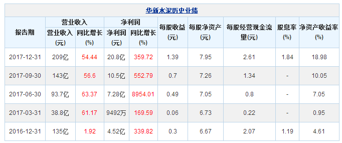 2017年,華新積極貫徹執(zhí)行國(guó)家在供給側(cè)結(jié)構(gòu)性改革、環(huán)保督查及錯(cuò)峰生產(chǎn)等方面的政策,著力實(shí)施“環(huán)保轉(zhuǎn)型、海外發(fā)展、電商創(chuàng)新、高新建筑材料拓展”戰(zhàn)略,以安全生產(chǎn)為基礎(chǔ),以“三個(gè)聚焦”為抓手,以創(chuàng)新發(fā)展為方向,加快推進(jìn)環(huán)保、骨料、新材料等新興業(yè)務(wù)發(fā)展,2017年度公司經(jīng)營(yíng)業(yè)績(jī)?cè)賱?chuàng)歷史新高。華新水泥3月26日公布的2017年年報(bào)顯示,其營(yíng)業(yè)收入209億元,同比增長(zhǎng)54.44%;歸屬于上市公司股東的凈利潤(rùn)20.8億元,同比增長(zhǎng)359.72%。