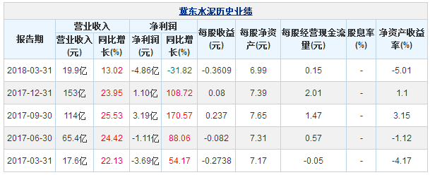 冀東水泥4月20日最新公布的2018年一季報(bào)顯示,其營(yíng)業(yè)收入19.9億元,同比增長(zhǎng)13.02%;歸屬于上市公司股東的凈利潤(rùn)-4.86億元,同比下降31.82%。