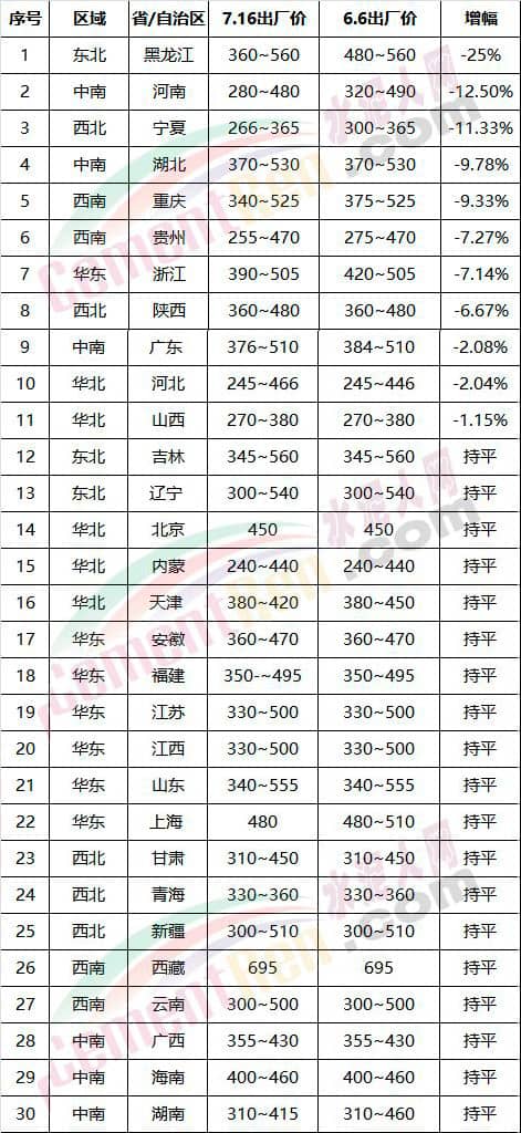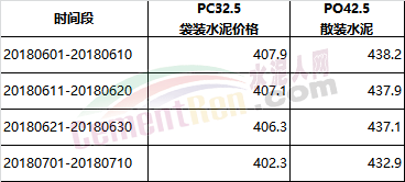 水泥價格方面,流通領(lǐng)域水泥市場價格變動不大,自6月1日至7月10日,水泥價格小幅下調(diào)。其中PC32.5袋裝水泥下調(diào)1.37%,PO42.5散裝水泥下調(diào)1.21%。詳情如下: