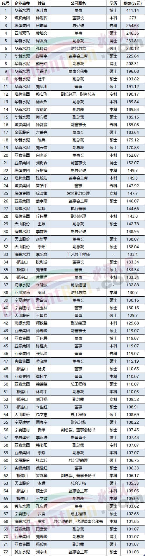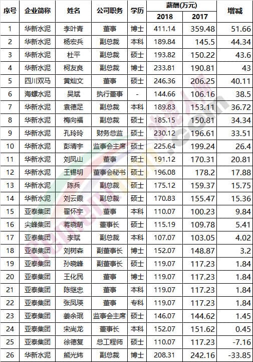 其中亞泰集團有14位高管年薪過百萬,華新水泥有13位高管年薪過百萬。是百萬年薪最多的水泥企業(yè)。