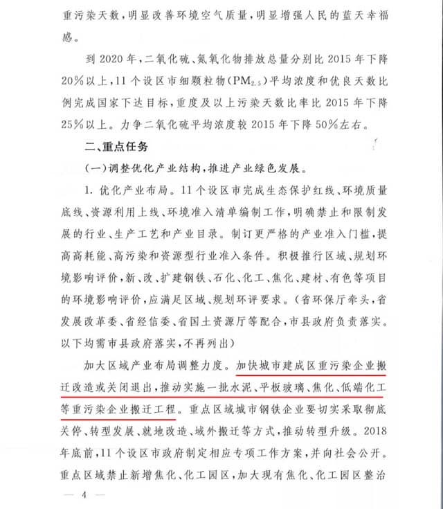 計(jì)劃的重點(diǎn)任務(wù)中提到調(diào)整優(yōu)化產(chǎn)業(yè)結(jié)構(gòu),推進(jìn)產(chǎn)業(yè)綠色發(fā)展。加大區(qū)域產(chǎn)業(yè)布局調(diào)整力度,加快城市建成區(qū)重污染企業(yè)搬遷改造或關(guān)閉退出,推動(dòng)實(shí)施水泥、平板玻璃、焦化、低端化工等重污染企業(yè)搬遷工程。