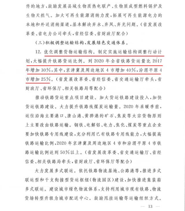 積極調(diào)整運(yùn)輸結(jié)構(gòu),發(fā)展綠色交通體系。優(yōu)化調(diào)整貨物運(yùn)輸結(jié)構(gòu),制定實(shí)施運(yùn)輸結(jié)構(gòu)調(diào)整行動(dòng)計(jì)劃,大幅提升鐵路貨運(yùn)比例。