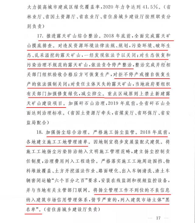 推進(jìn)露天礦山綜合整治,2018年底前,全面完成露天礦山摸底排查。對(duì)違反資源環(huán)境法律法規(guī)、規(guī)劃,污染環(huán)境、破壞生態(tài)、亂采濫亂的露天礦山,一經(jīng)發(fā)現(xiàn)依法予以關(guān)閉;對(duì)生態(tài)恢復(fù)和污染治理不規(guī)范的露天礦山,依法責(zé)令停產(chǎn)整治。對(duì)拒不停產(chǎn)或擅自恢復(fù)生產(chǎn)的依法強(qiáng)制關(guān)閉,對(duì)責(zé)任主體滅失的露天礦山,當(dāng)?shù)卣M織有關(guān)部門加強(qiáng)修復(fù)綠化,減塵抑塵。重點(diǎn)區(qū)域原則上禁止新建露天礦山建設(shè)項(xiàng)目。