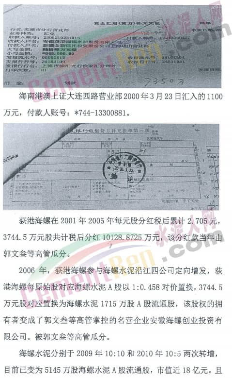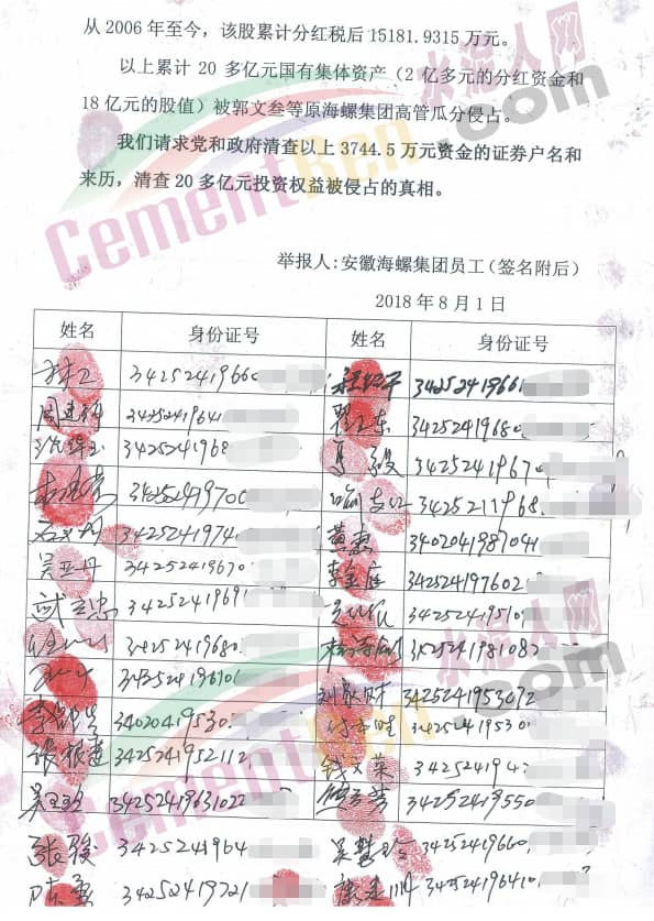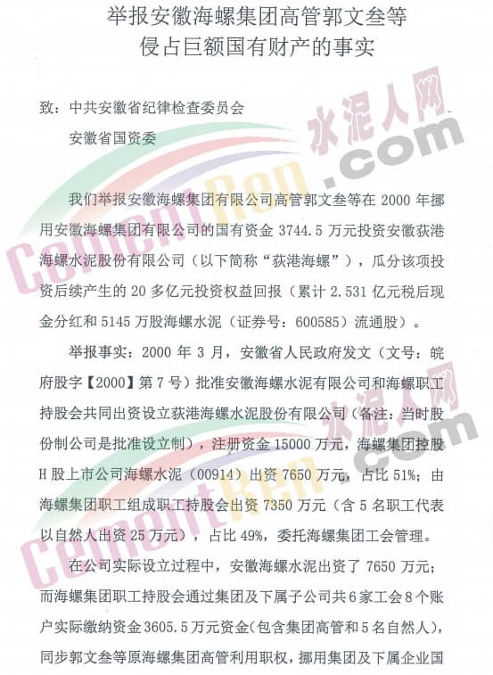 【水泥人網(wǎng)】近日,水泥人網(wǎng)收到一封關(guān)于《舉報(bào)安徽海螺集團(tuán)高管郭文叁等侵占巨額國(guó)有財(cái)產(chǎn)的事實(shí)》的實(shí)名舉報(bào)材料,截止目前已有78名員工聯(lián)名簽字,具體內(nèi)容如下文所示: