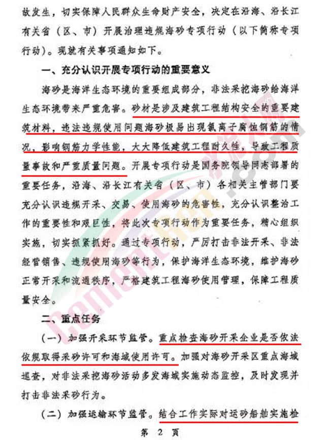 通知文件稱:近期,媒體反映部分地區(qū)大量違規(guī)海砂涌入建筑市場,嚴重威脅建筑工程質(zhì)量。為貫徹落實國務院領導同志重要批示要求嚴厲打擊違規(guī)開采、交易、使用海砂行為,防范建筑工程質(zhì)量事故發(fā)生,切實保障人民群眾生命財產(chǎn)安全,決定在沿海、沿長江有關省(區(qū)、市)開展治理違規(guī)海砂專項行動。