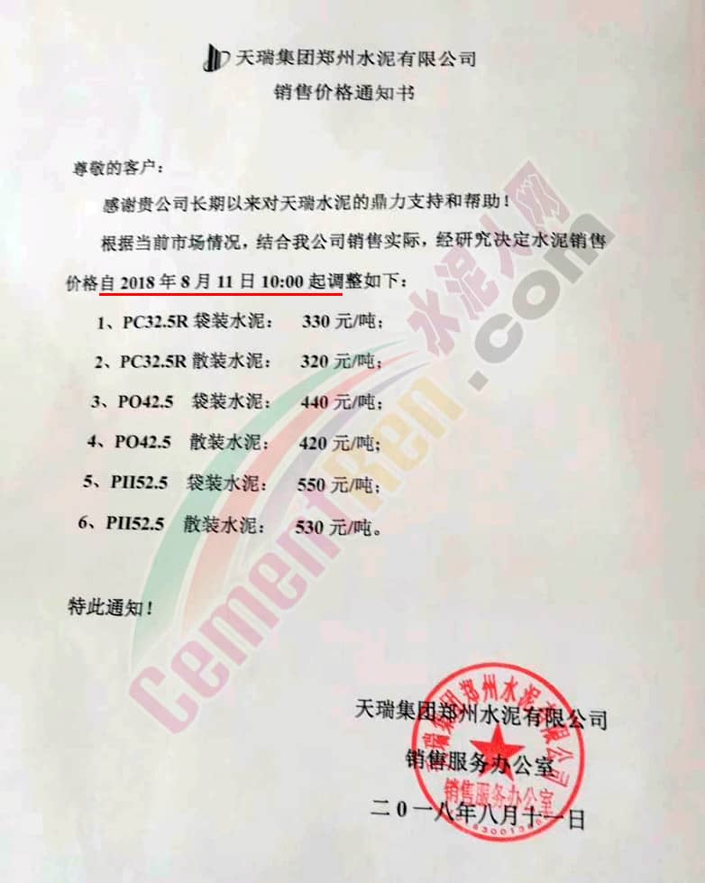 其中:天瑞集團鄭州水泥有限公司銷售價格通知書稱,根據(jù)當(dāng)前市場情況,結(jié)合公司銷售實際,決定上調(diào)水泥銷售價格,自8月11日10點起執(zhí)行新價格。