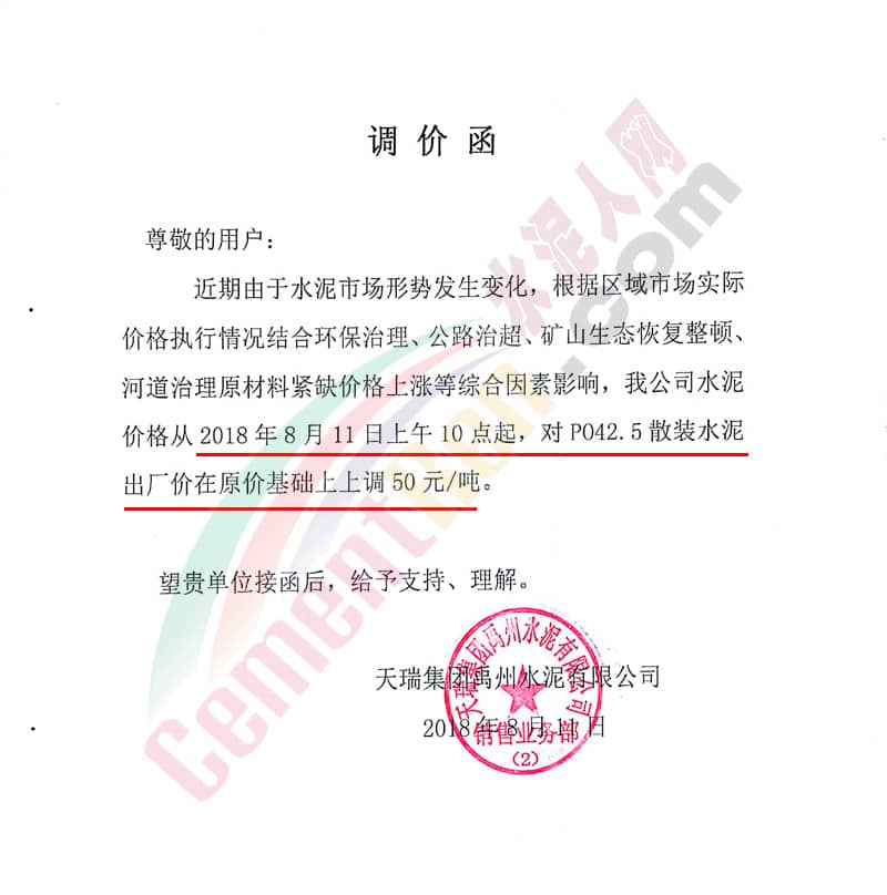 天瑞集團許昌水泥有限公司價格調(diào)整告知函稱,根據(jù)目前環(huán)保力度增大,為了做好去產(chǎn)能和節(jié)能減排工作,有效消化錯峰生產(chǎn)、原材料漲價帶來的成本增加,本著長期誠信服務(wù)、深度合作、互惠共贏的經(jīng)營理念,為了公司的可持續(xù)發(fā)展,自2018年8月11日上午10點起對PC32.5R級水泥統(tǒng)一上調(diào)20元/噸,PO42.5級水泥統(tǒng)一上調(diào)50元/噸。