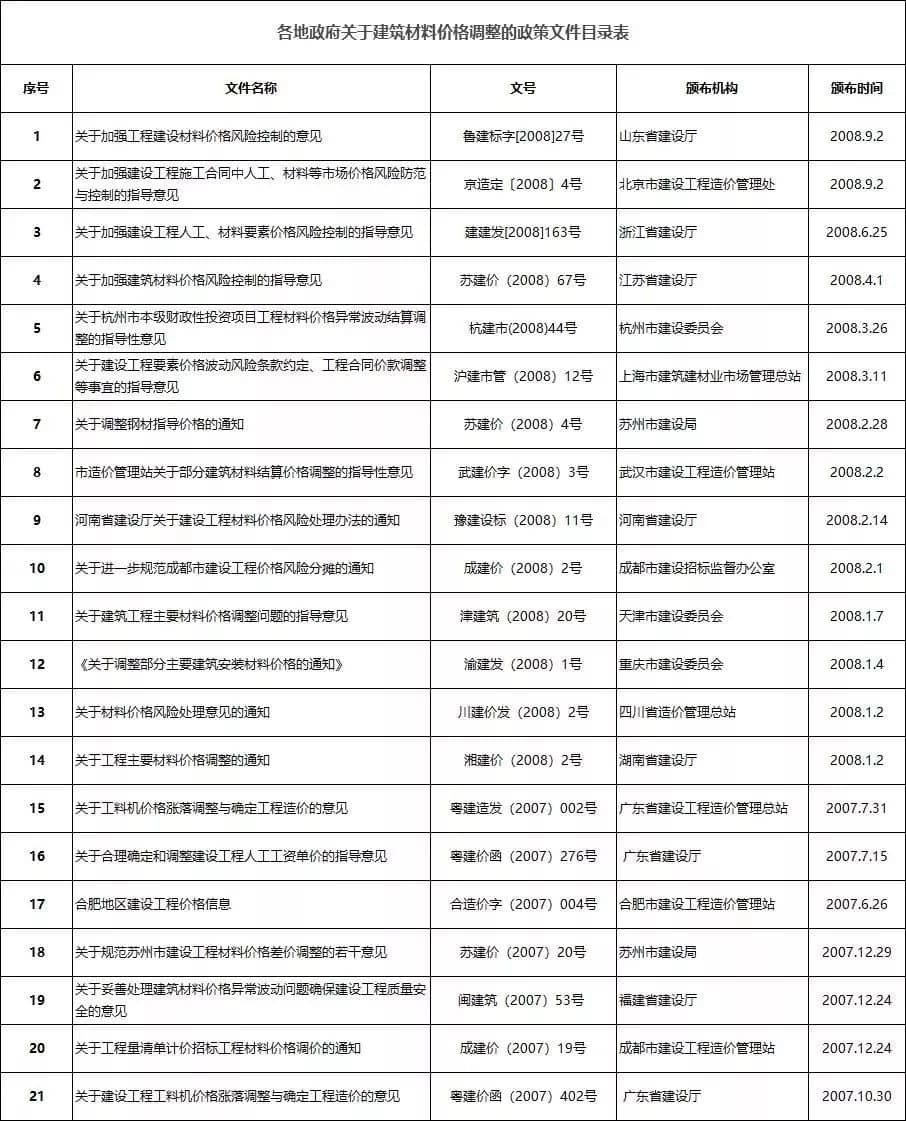其實(shí)早在2007、2008年,因人工、材料(設(shè)備)、施工機(jī)械臺(tái)班價(jià)格等出現(xiàn)持續(xù)大幅度的漲落,全國多個(gè)省份已出臺(tái)文件就這類問題作出明確說明。大多數(shù)地區(qū),在文件中詳細(xì)列出了價(jià)差調(diào)整的幅度范圍與方法。(因時(shí)間跨度較長(zhǎng),下表所列文件可能部分已失效,表中列出僅作參考,不具有實(shí)際指導(dǎo)作用!)