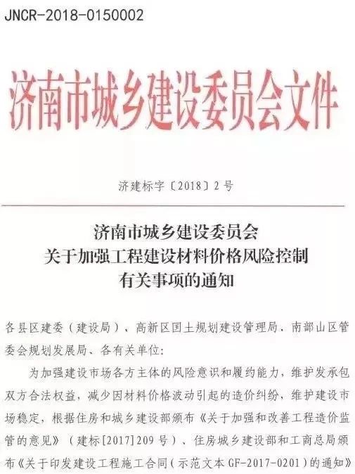2018年1月30日,濟(jì)南市住建委印發(fā)《關(guān)于加強(qiáng)工程建設(shè)材料價(jià)格風(fēng)險(xiǎn)控制有關(guān)事項(xiàng)的通知》(濟(jì)建標(biāo)字〔2018〕2號(hào)),明確工程計(jì)價(jià)中應(yīng)推行風(fēng)險(xiǎn)共擔(dān)和合理分?jǐn)傇瓌t,承包人應(yīng)有限度承擔(dān)材料價(jià)格等市場(chǎng)風(fēng)險(xiǎn)。