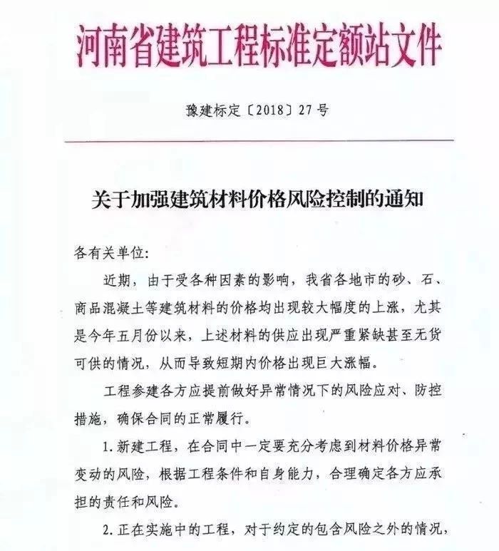 近日,河南省發(fā)布《關(guān)于加強(qiáng)建筑材料價(jià)格風(fēng)險(xiǎn)控制的通知》,對(duì)工程參建各方提出了應(yīng)對(duì)異常情況的意見。