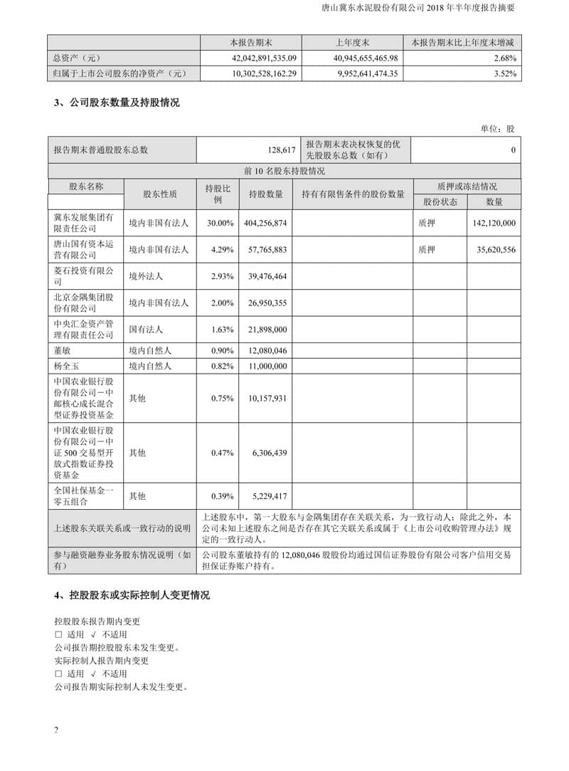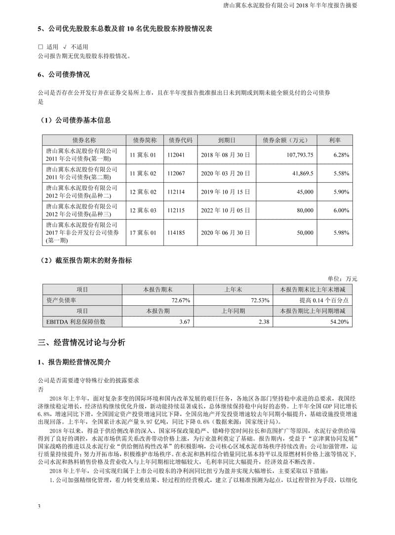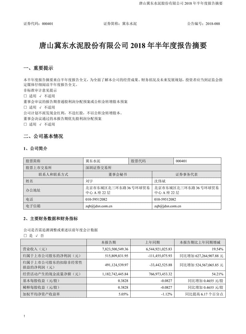 【水泥人網(wǎng)】冀東水泥(000401)8月9日晚發(fā)布半年報,公司上半年營收78.24億元,同比增長19.54%;凈利5.16億元,同比扭虧,上年同期虧損1.11億元;每股收益0.38元。報告期,水泥市場供需關(guān)系改善帶動價格上漲。公司水泥和熟料售價及營業(yè)收入與上年同期相比增幅較大,毛利率同比大幅提升。