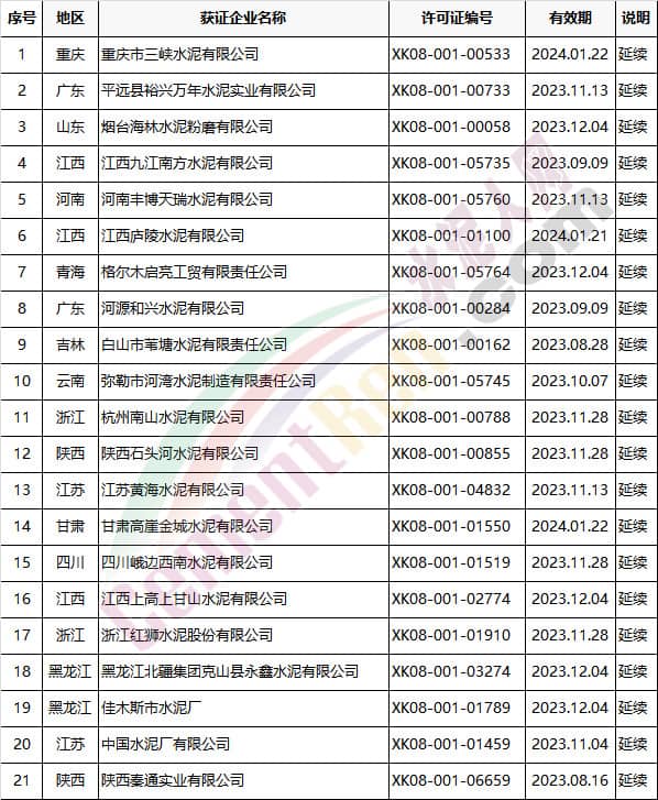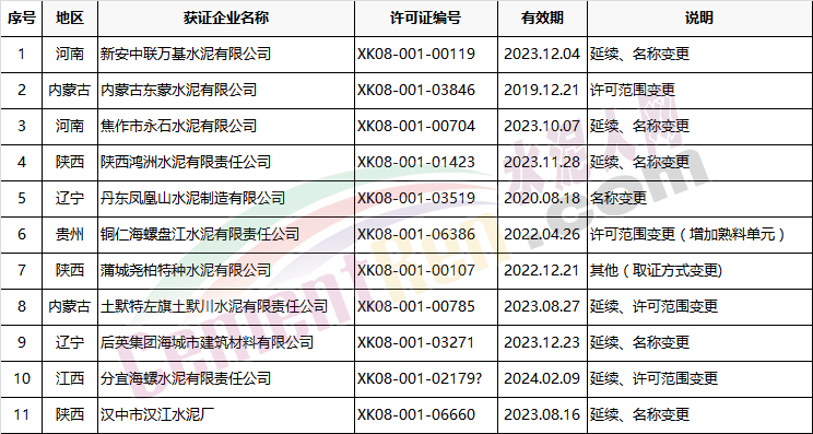 【水泥人網(wǎng)】日前,國家質(zhì)檢總局全國工業(yè)產(chǎn)品生產(chǎn)許可證辦公室發(fā)放8月份第二批水泥企業(yè)生產(chǎn)許可證。共33個證書編號,其中新發(fā)證書一家企業(yè),為寧夏金昱元廣拓能源有限公司;到期延續(xù)21家企業(yè);涉及名稱變更、許可范圍變更和取證方式變更共11家企業(yè)。詳情如下: