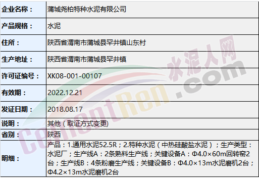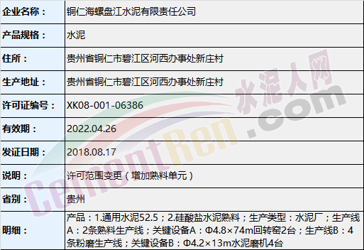 以上涉及變更的企業(yè)中,貴州銅仁海螺盤江水泥有限責(zé)任公司許可范圍變更內(nèi)容為增加熟料單元;陜西蒲城堯柏特種水泥有限公司為取證方式變更。變更后生產(chǎn)許可證詳情如下: