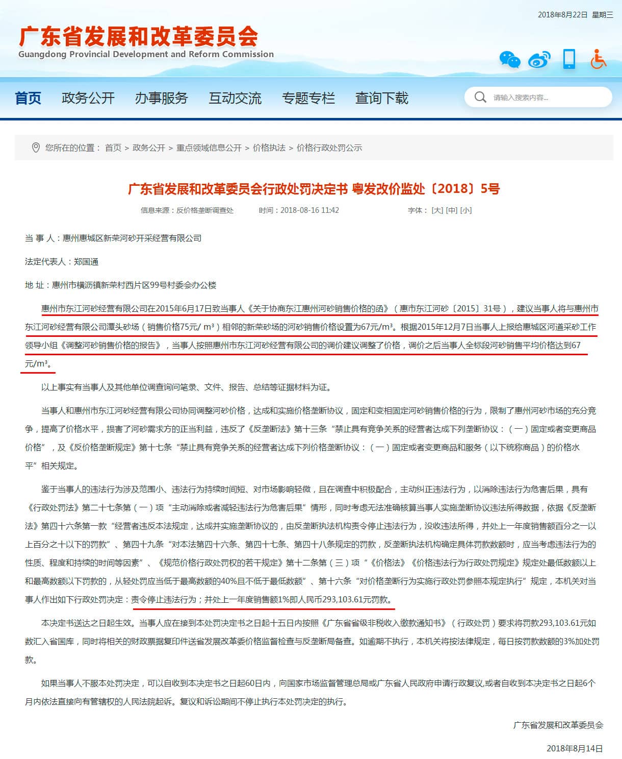 【水泥人網(wǎng)】日前,廣東省發(fā)改委發(fā)布行政處罰決定書(粵發(fā)改價監(jiān)處〔2018〕5號),責令惠州惠城區(qū)新榮河砂開采經(jīng)營有限公司停止違法行為;并處上一年度銷售額1%即人民幣293,103.61元罰款。