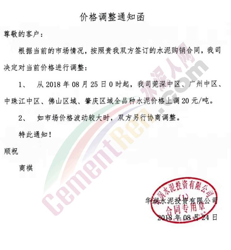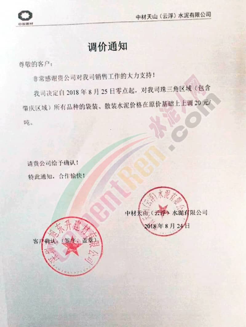 【水泥人網(wǎng)】近兩日廣東珠三角區(qū)域多家企業(yè)發(fā)布提價(jià)通知稱上調(diào)水泥價(jià)格。