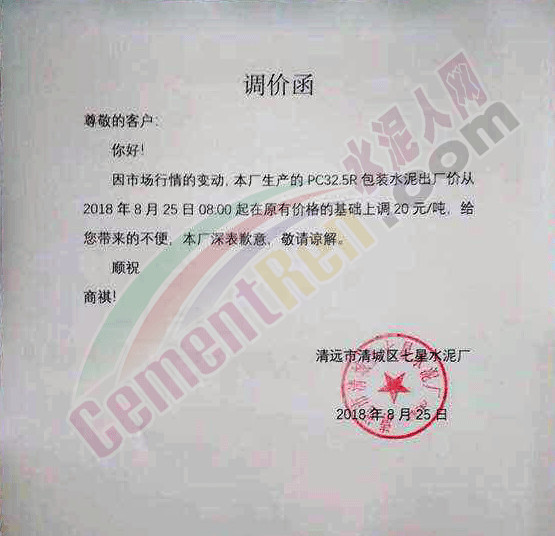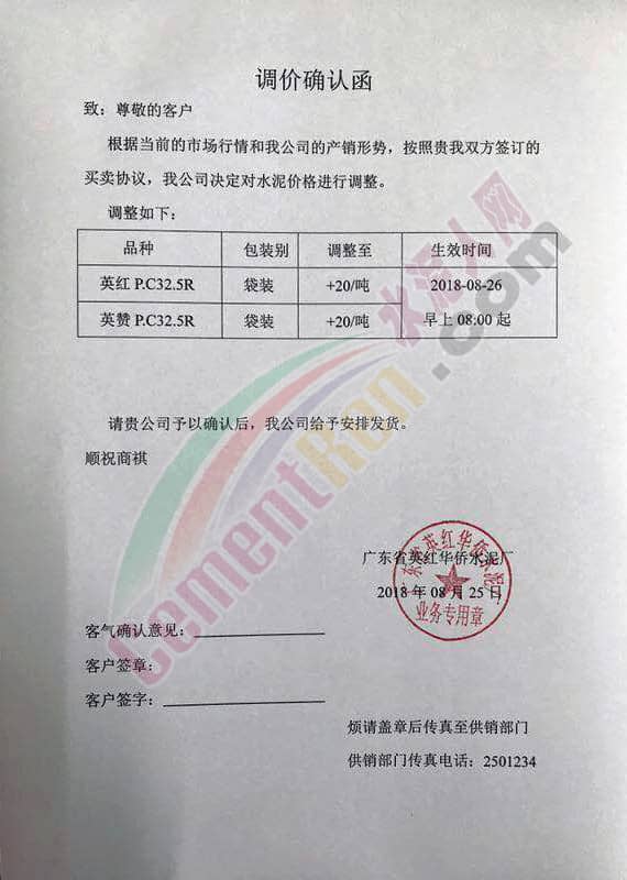 英德海螺、清新海螺、佛山海螺發(fā)布提價(jià)通知,自2018年8月25日起各標(biāo)號(hào)水泥在原價(jià)基礎(chǔ)上上調(diào)20元/噸。