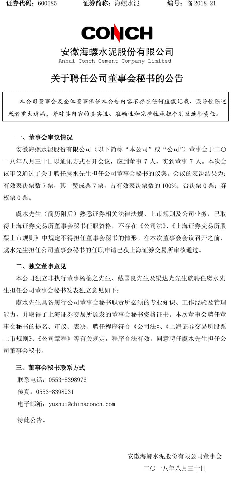 【水泥人網(wǎng)】海螺水泥(00914)8月30日晚間公告,虞水已獲委任為公司聯(lián)席公司秘書,任命于2018年8月30日生效。虞水生將與公司現(xiàn)時(shí)的公司秘書趙不渝共同出任聯(lián)席公司秘書職務(wù)。虞水亦獲委任為董事會(huì)秘書,任命于2018年8月30日生效。