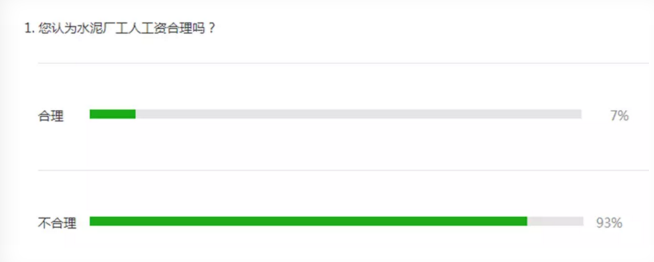 先讓我們回顧一下前幾日水泥人網(wǎng)微信公眾平臺(tái)發(fā)起的您認(rèn)為水泥廠工人工資合理嗎?的民意調(diào)查吧,在短短的1天的時(shí)間內(nèi),有近萬人參與了投票,根據(jù)奮斗在一線的水泥工人投票結(jié)果顯示,有93%的人認(rèn)為一線工人工資不合理,剩余7%的工人認(rèn)為工資是合理的。