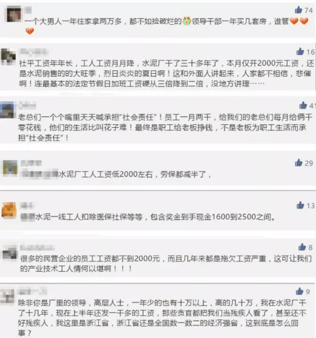 薪資問題永遠(yuǎn)是一個(gè)熱門問話題,因水泥行業(yè)的薪資太低,普通員工薪資在1500~3000元/月不等。有網(wǎng)友留言“一個(gè)大男人一年往家拿兩萬多,都不如撿破爛的。”; “一線員工,忍著高溫、噪音、粉塵的危害實(shí)在不容易”;“這個(gè)確實(shí)是血汗錢,夏天熱死,冬天冷死”。水泥行業(yè)生產(chǎn)一線工人的苦累自不必多言。