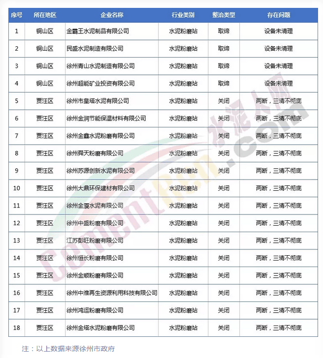 近日江蘇省徐州市政府印發(fā)《徐州市2018-2019年秋冬季大氣污染綜合治理攻堅行動方案》。方案提出對保留和處于過渡期內(nèi)已按要求完成整治并通過復產(chǎn)驗收的水泥粉磨站,在黃色及以上重污染天氣預警期間實施停產(chǎn),徐州市共19家粉磨站企業(yè)列入管控名單。同期公布的徐州市“散亂污”企業(yè)集中整治專項行動現(xiàn)場核查問題清單顯示,有18家粉磨站企業(yè)列入關閉、取締名單。
