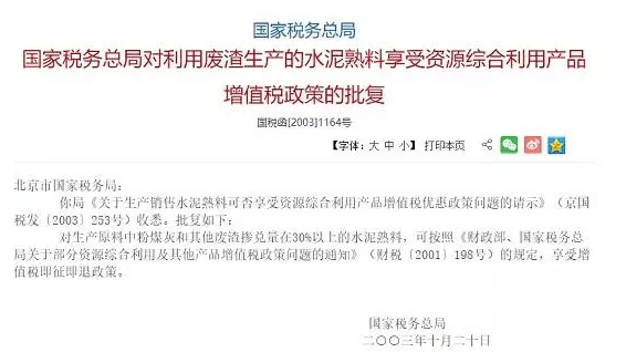 熟料享受資源綜合利用產(chǎn)品增值稅政策的批復(fù)》,文內(nèi)批復(fù)表示,對(duì)生產(chǎn)原料中粉煤灰和其他廢渣摻兌量在30%以上的水泥熟料,可按照《財(cái)政部、國(guó)家稅務(wù)總局關(guān)于部分資源綜合利用及其他產(chǎn)品增值稅政策問(wèn)題的通知》(財(cái)稅〔2001〕198號(hào))的規(guī)定,享受增值稅即征即退政策。